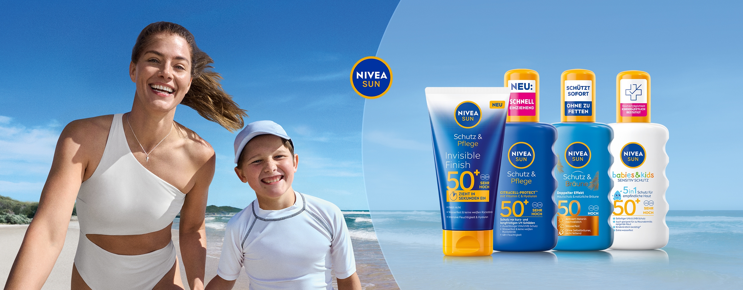 Entdecke das NIVEA Sun Sortiment: Kaufe 2 NIVEA SUN Produkte und erhalte das Geld für das günstigere Produkt zurück!
