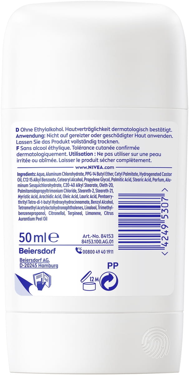 Inkludiert Aqua, Aluminum Chlorohydrate, PPG-14 Butyl Ether, Cetyl Palmitate, Hydrogenated Castor Oil, C12-15 Alkyl Benzoate, Cetearyl Alcohol, Propylenglykol, Palmitic Acid, Stearic Acid, Parfum, Aluminum Sesquichlorohydrate, C20-40 Alkyl Stearate, Oleth-20, Palmitamidopropyltrimonium Chloride, Steareth-2, Steareth-21, Myristic Acid, Arachidic Acid, Oleic Acid, Lauric Acid, Pentaerythrityl Tetra-di-t-butyl Hydroxyhydrocinnamate, Benzyl Alcohol, Tetramethyl Acetyloctahydronaphthalenes, Linalool, Trimethylbenzenepropanol, Citronellol, Terpineol, Limonene, Citrus Aurantium Peel Oil
