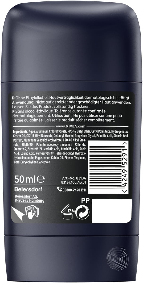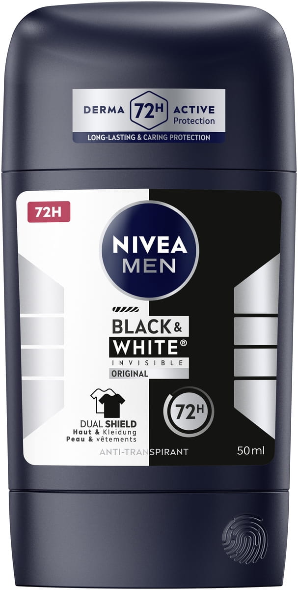 Die NIVEA MEN Black & White Invisible mit Dual-Shield-Technologie schützt schwarze Kleidung vor weißen Flecken und weiße Kleidung vor gelben Flecken. Zuverlässiges 72-Stunden- Anti-Transpirant gegen Schweiß und Geruch, das Ihre Haut und Ihre Kleidung schützt.