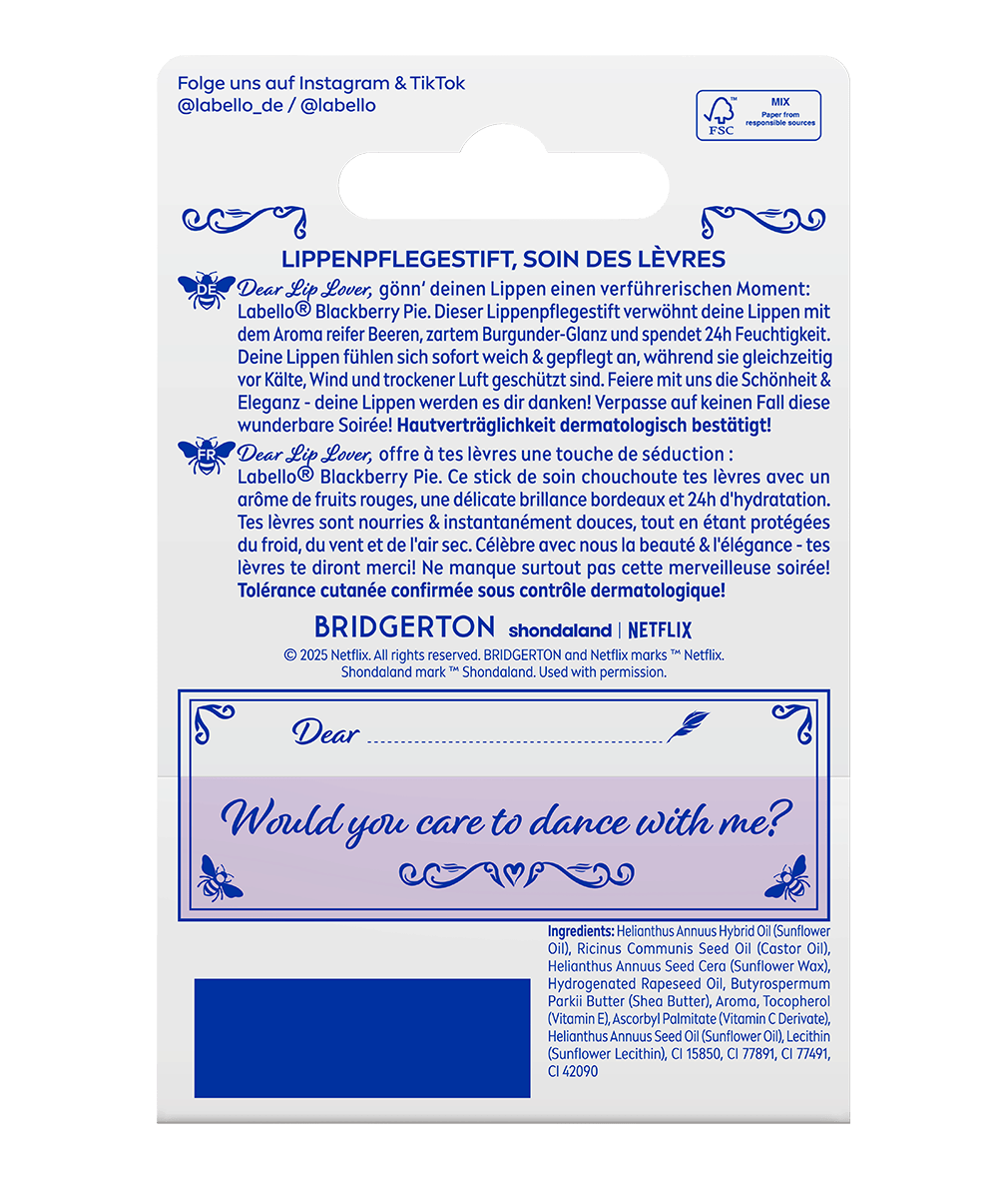 Labello Blackberry Pie sanft auf die Lippen auftragen für intensive Pflege und einen Hauch Farbe.