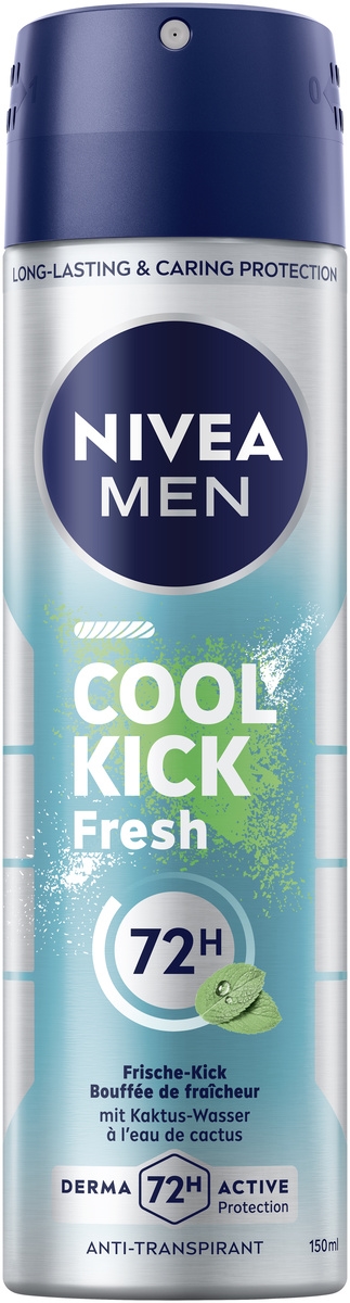 NIVEA MEN Cool Kick Fresh Anti-Transpirant bietet einen Kick aus kraftvoller Frische mit Kaktuswasser. Zuverlässiger 72h Anti-Transpirant-Schutz, der Ihre Haut pflegt.