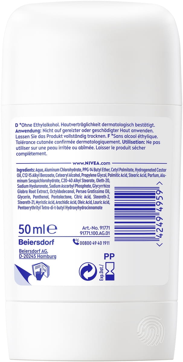 Inkludiert Aqua, Aluminum Chlorohydrate, PPG-14 Butyl Ether, Cetyl Palmitate, Hydrogenated Castor Oil, C12-15 Alkyl Benzoate, Cetearyl Alcohol, Propylenglykol, Palmitic Acid, Stearic Acid, Parfum, Aluminum Sesquichlorohydrate, C20-40 Alkyl Stearate, Oleth-20, Sodium Hyaluronate, Sodium Ascorbyl Phosphate, Glycyrrhiza Glabra Root Extract, Octyldodecanol, Persea Gratissima Oil, Glycerin, Panthenol, Pantolactone, Zitronensäure, Steareth-2, Steareth-21, Myristic Acid, Arachidic Acid, Oleic Acid, Lauric Acid, Pentaerythrityl Tetra-di-t-butyl Hydroxyhydrocinnamate