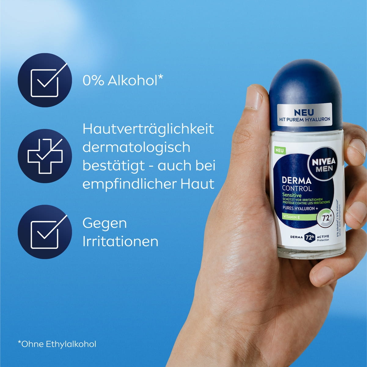 NIVEA MEN Derma Control Sensitive Roll-On bietet 72 Stunden zuverlässigen Anti-Transpirant-Schutz und pflegt empfindliche Haut mit purem Hyaluron und Vitamin E, um Hautreizungen zu vermeiden.