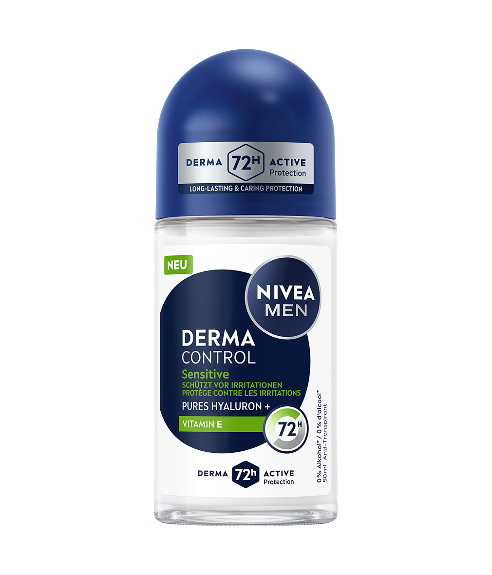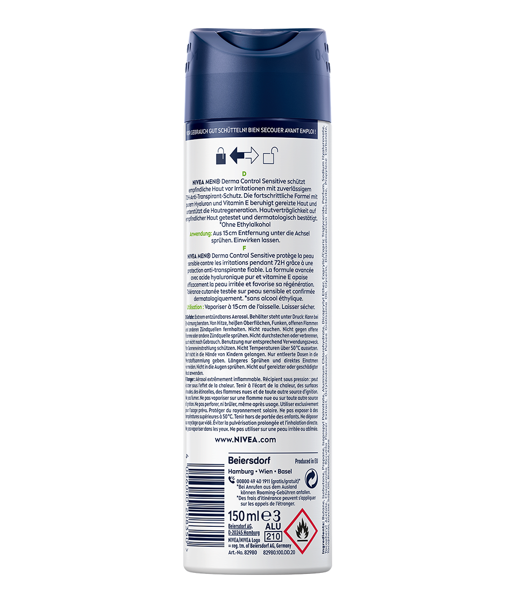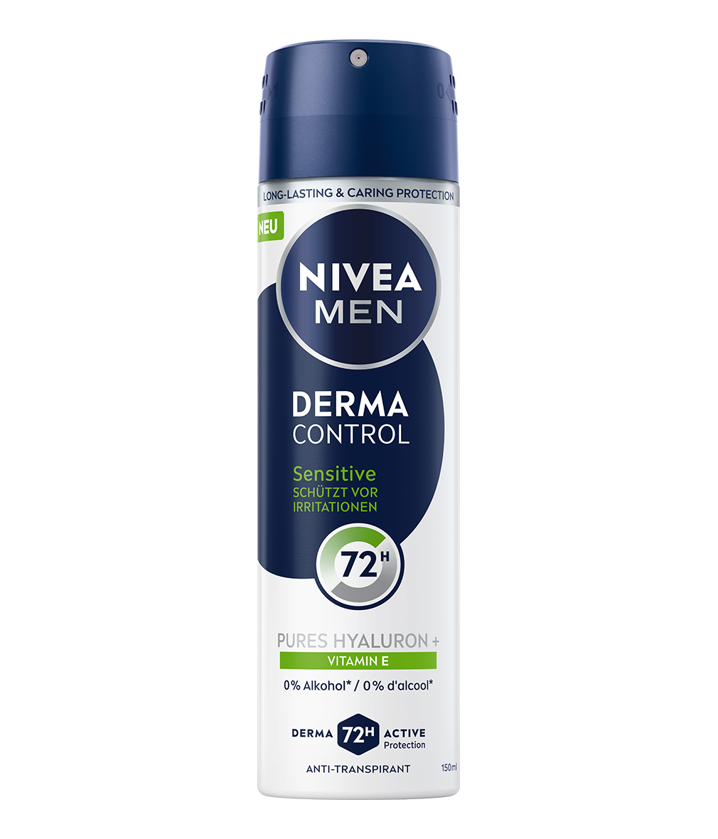 NIVEA MEN Derma Control Sensitive Deo Spray schützt mit purem Hyaluron und Vitamin E vor Irritationen, beugt Hautreizungen vor und bietet 72h zuverlässigen Anti-Transpirant-Schutz bei sanfter Pflege.