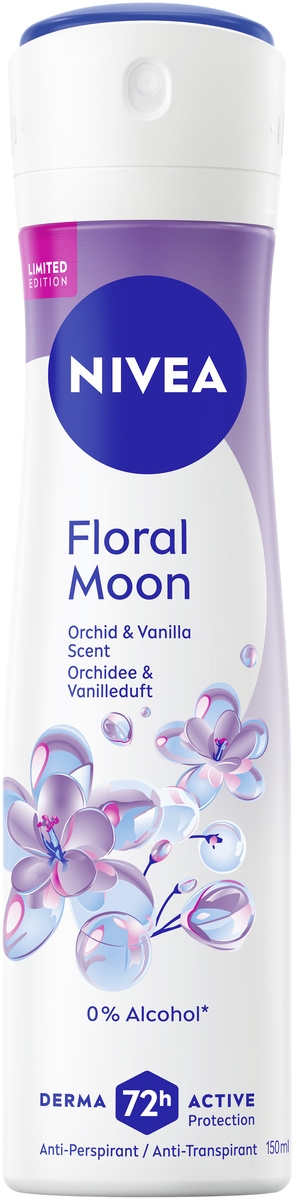 NIVEA Floral Moon Anti-Transpirant bietet 72 Stunden aktiven Schutz mit einem erfrischenden Duft nach Orchidee & Vanille. 0 % Alkohol und dermatologisch getestet für weiche, glatte Achseln.