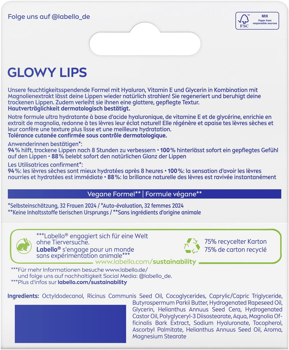 Labello® GLOWY LIPS verstärkt sofort den natürlichen Glanz deiner Lippen. Dieser Lippenbalsam enthält eine ultra-feuchtigkeitsspendende Formel mit Hyaluronsäure, Vitamin E und Glycerin in Kombination mit Magnolie und spendet 24 Stunden lang Feuchtigkeit. Er regeneriert und beruhigt deine trockenen Lippen und verleiht ihnen eine glattere Textur. Labello® ist sanft zu jeder Lippenhaut und trocknet Ihre Lippen nicht aus.