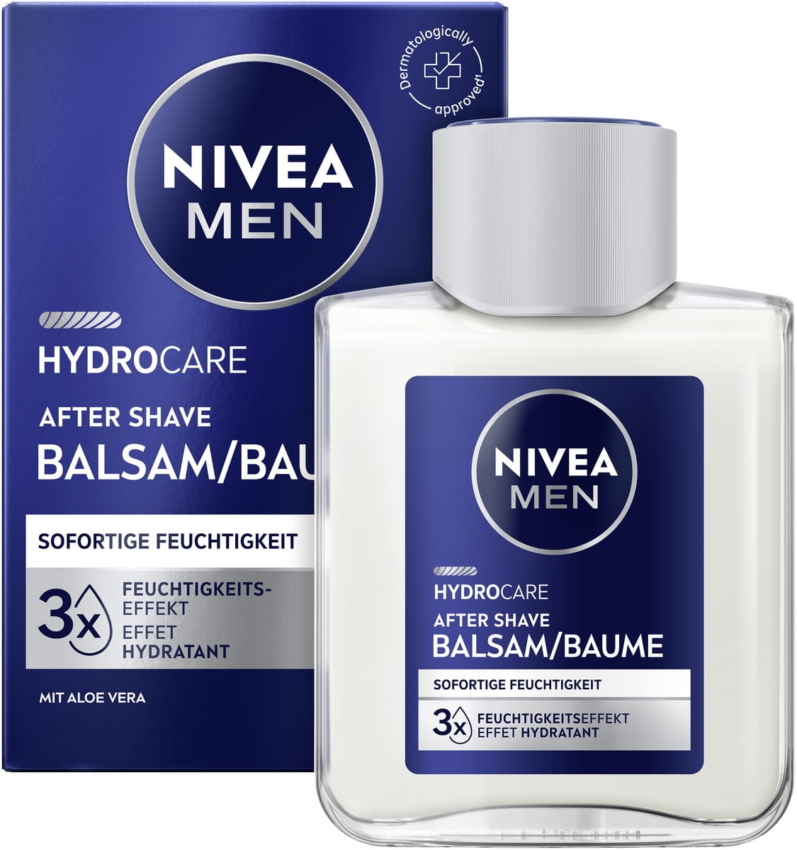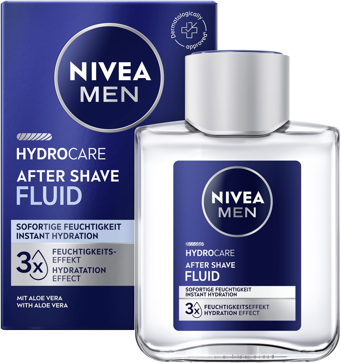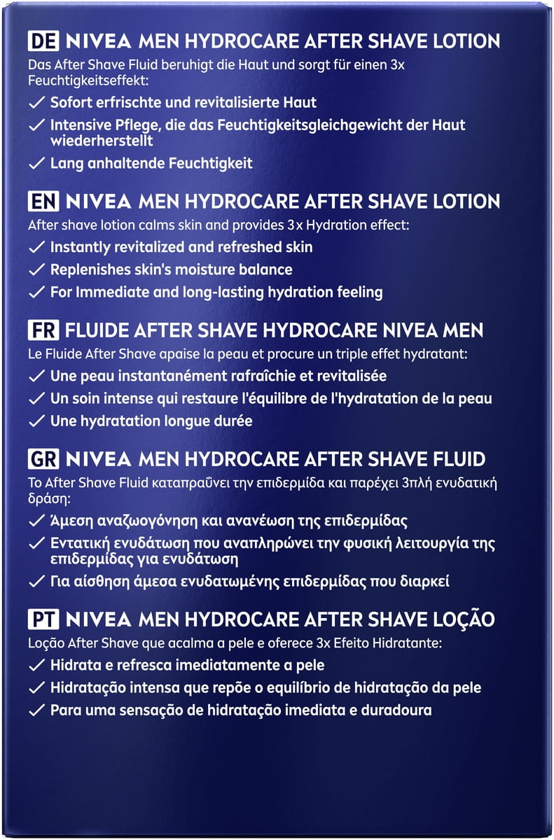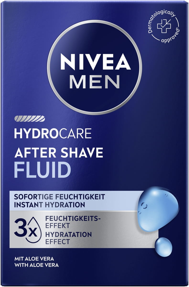 NIVEA MEN Hydrocare After Shave Fluid spendet mit Aloe Vera sofort Feuchtigkeit, beruhigt die Haut nach der Rasur und zieht schnell ein – für ein frisches, nicht fettendes Hautgefühl.