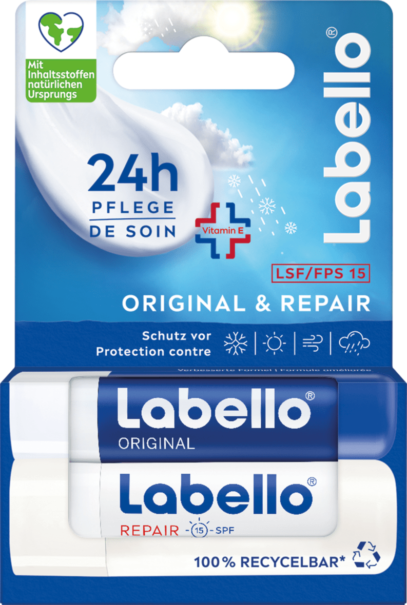 Der Labello Original und Labello Repair im praktischen All-Weather Set schützt 24 Stunden vor dem Austrocknen.