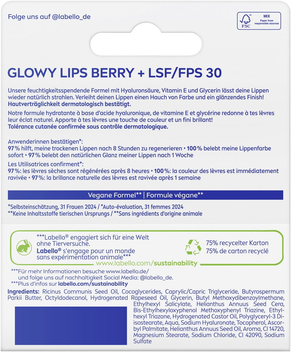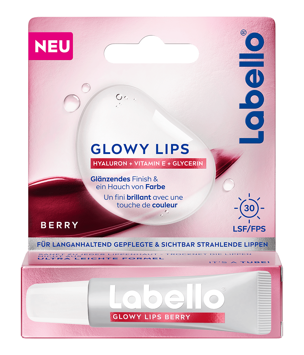 Labello® GLOWY LIPS BERRY schenkt deinen Lippen einen Hauch von Farbe und einen natürlichen Glanz. Für langanhaltend gepflegte und sichtbar strahlende Lippen mit LSF 30.