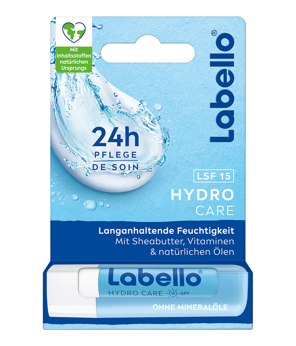 Die wirksame Formel des Labello Hydro Care ist ohne Mineralöl und spendet 24 Stunden Pflege und Feuchtigkeit.