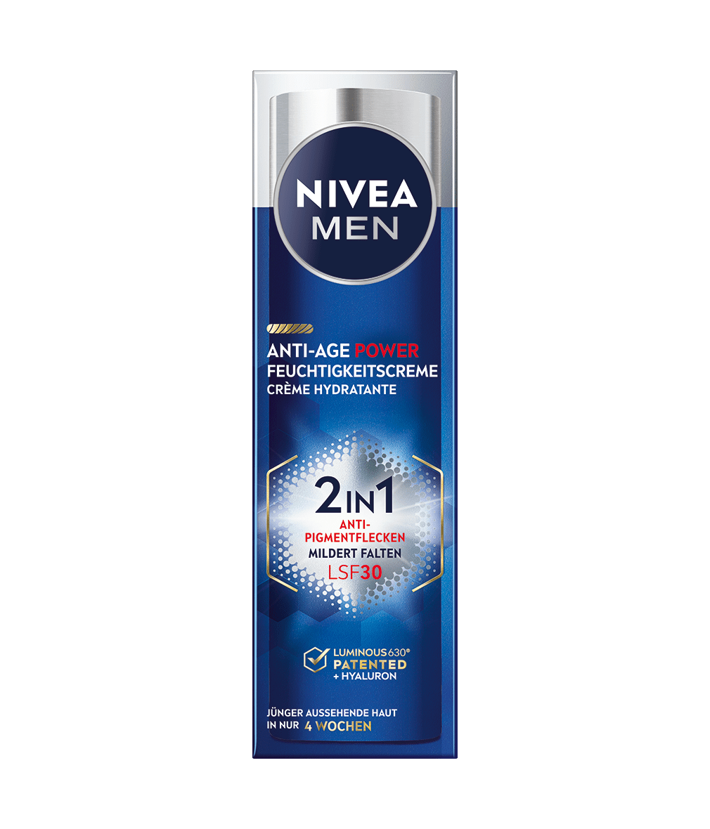 NIVEA MEN ANTI-AGE POWER FEUCHTIGKEITSCREME kombiniert HYALURON mit dem patentierten Anti-Pigment-Wirkstoff LUMINOUS630® für eine fortschrittliche Fleckenreduzierung mit Anti-Age-Effekt.
