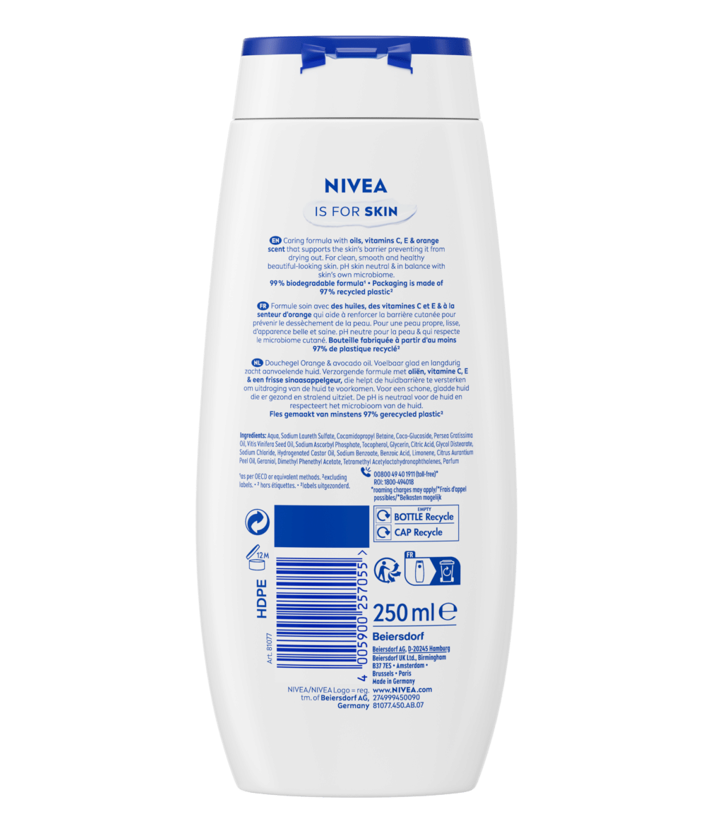 Die NIVEA Orange & Avocado Oil Pflegedusche sorgt für spürbar glatte Haut und ein lang anhaltendes, weiches Hautgefühl. Das NIVEA-Duschgel für den täglichen Gebrauch mit Avocadoöl verleiht Ihrer Haut ein gesundes Gefühl und verwöhnt Ihre Sinne mit einem zarten Orangenduft.