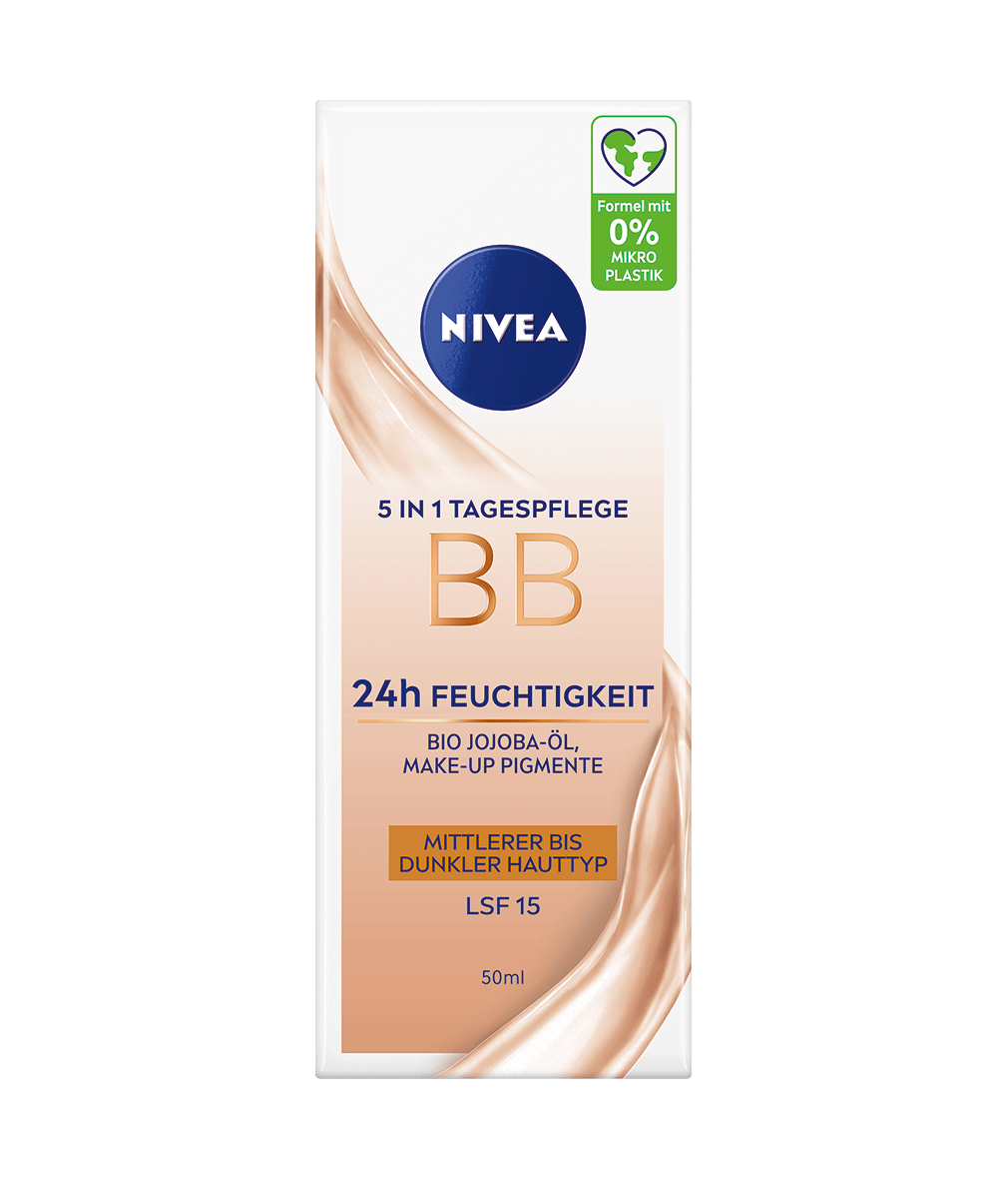 Diese BB Tagespflege ist ideal für mittlere bis dunkle Hauttypen geeignet. Sie deckt kleine Schönheitsmakel, wie Anzeichen von Müdigkeit, rötliche Partien und kleine Fältchen ab und schützt die Haut vor lichtbedingter Hautalterung mit LSF 15, 50ml: NIVEA 5 IN 1 TAGESPFLEGE BB 24h FEUCHTIGKEIT.