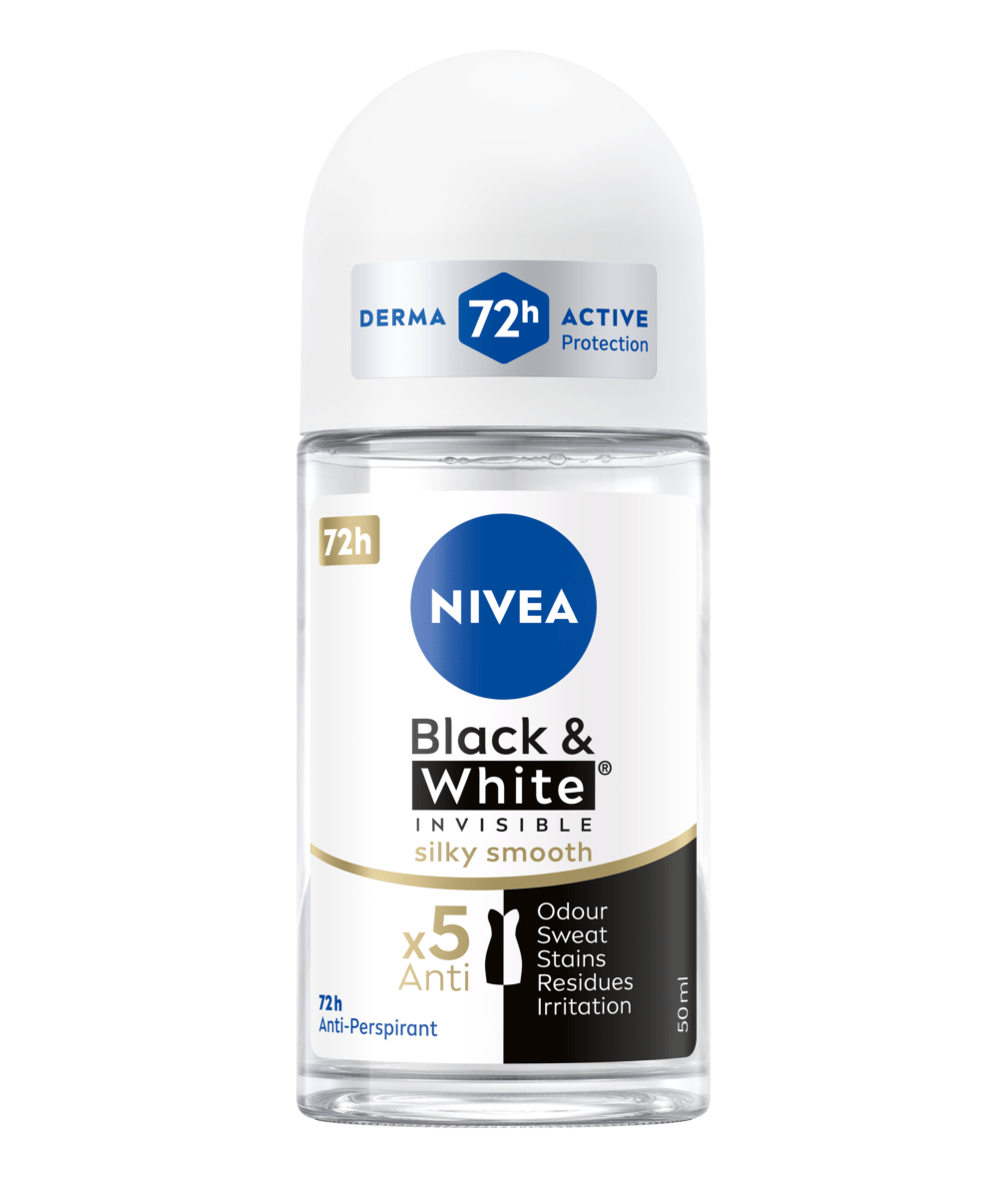NIVEA Black & White Invisible Silky Smooth Deo Roll-On schützt vor weißen Rückständen auf dunklen Textilien und gelben Flecken auf weißer Kleidung durch die patentierte Anti-Flecken-Technologie. Das starke Anti-Transpirant schützt 72 Stunden vor Achselnässe und Körpergeruch und pflegt die Haut.