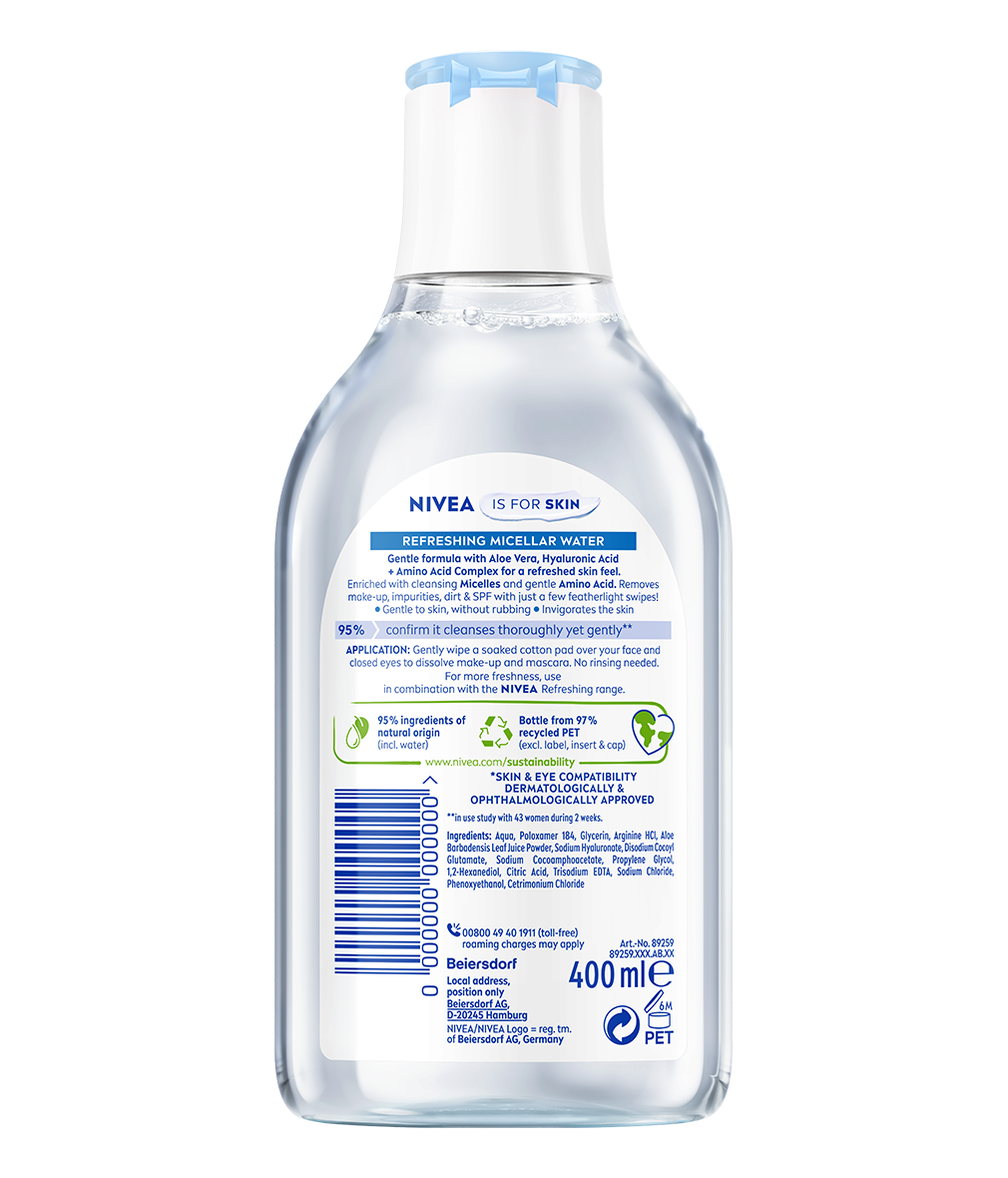 Beleben Sie Ihre Haut mit NIVEA erfrischendem Mizellenwasser. Mit Aloe Vera, Hyaluronsäure und Aminosäurekomplex entfernt es sanft Make-up, Unreinheiten, Schmutz und Sonnenschutzmittel und hinterlässt Ihre Haut sauber, hydratisiert und rückstandsfrei.