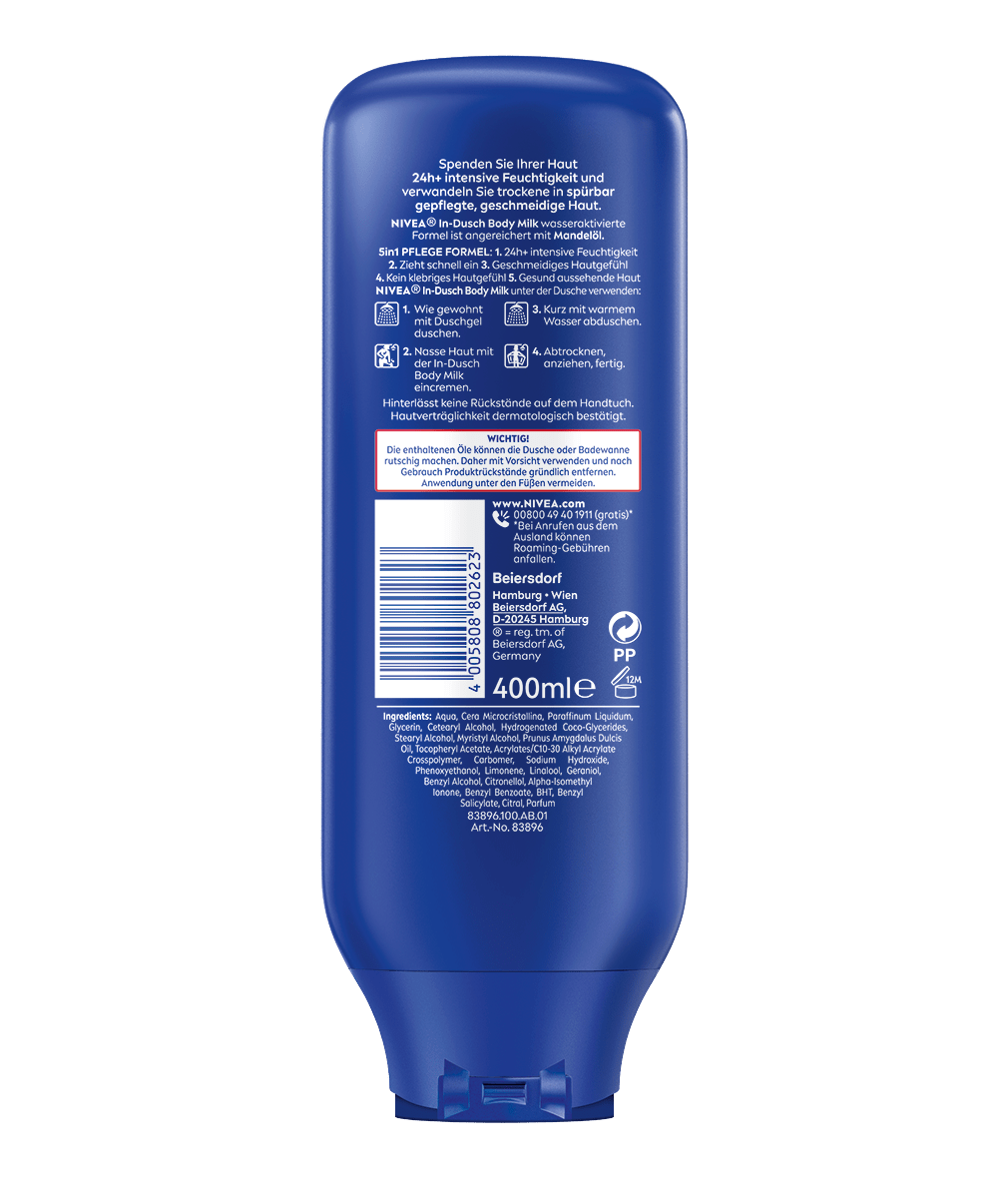 Die reichhaltige Hautpflege für die Dusche. Einfach nach dem Duschen auf die nasse Haut auftragen, abduschen und abtrocknen. Fertig: NIVEA In-Dusch Body Milk.