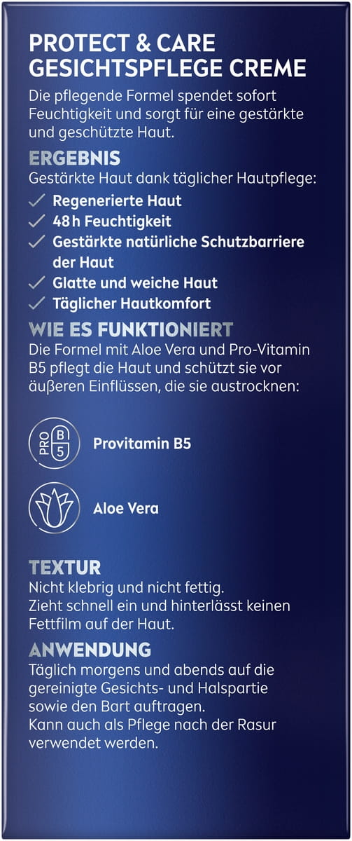 Die Gesichtspflege für Männer mit normaler bis trockener Haut. Beruhigt, belebt und bewahrt die Haut vor schädlichen Umwelteinflüssen: Protect & Care Gesichtspflege Creme.