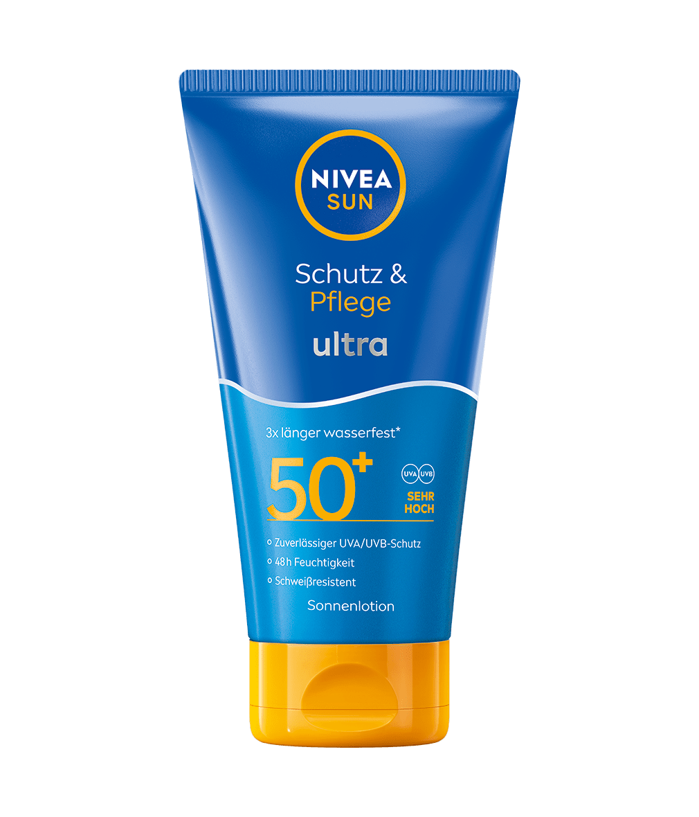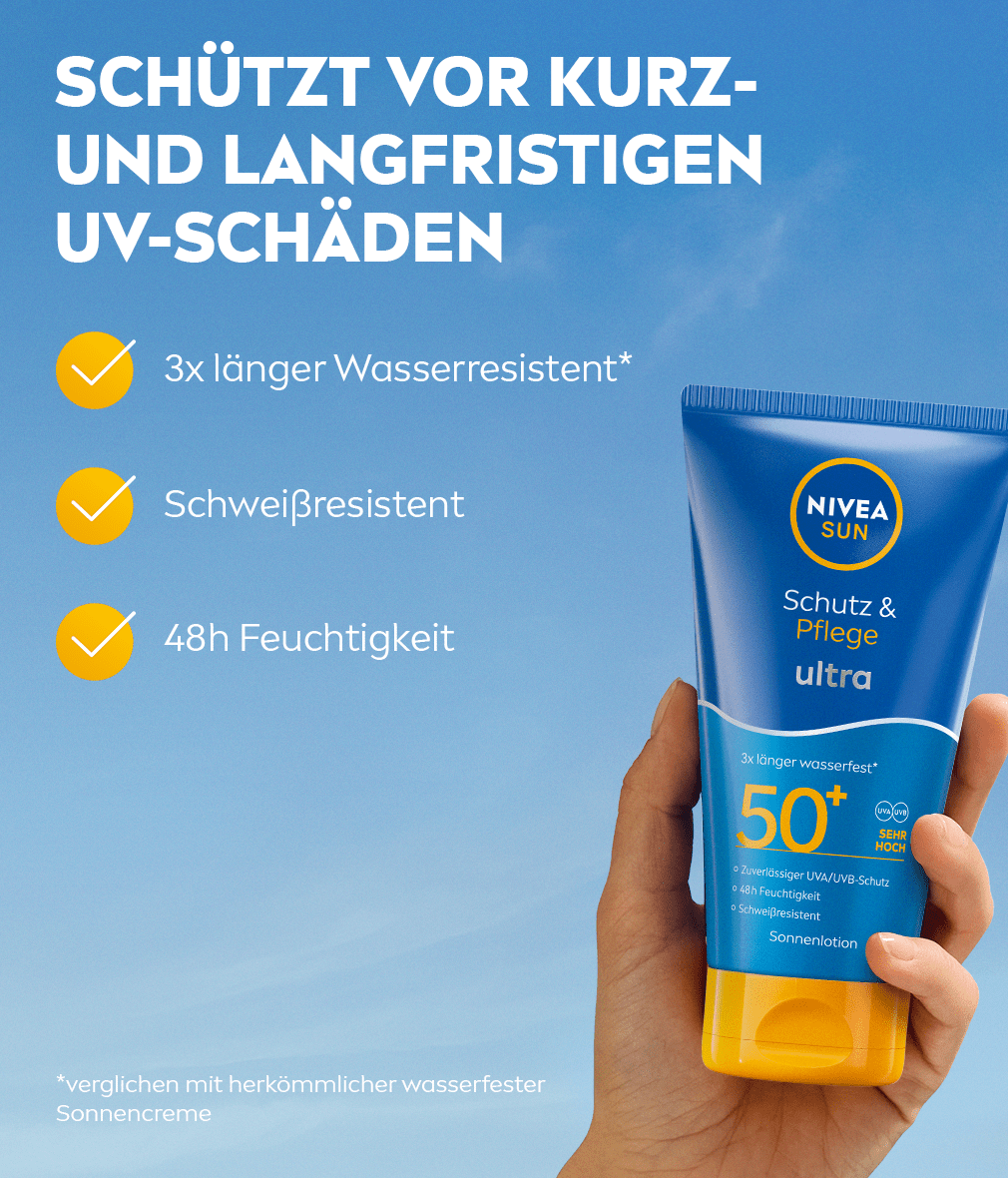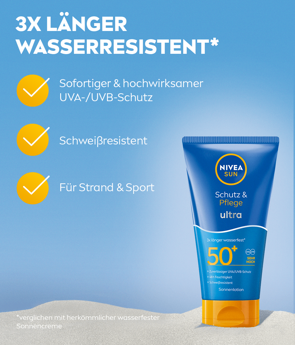 3x längere Wasserfestigkeit im Vergleich zu herkömmlichen wasserfesten Sonnenschutzmitteln mit sofortigem und lang anhaltendem UV-Schutz: NIVEA SUN Protect & Moisture Ultra Sonnencreme
