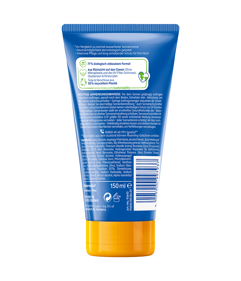 - Nachhaltigkeit – Die Formel schont die Meere, da sie frei von den UV-Filtern Octinoxat, Oxybenzon und Octocrylen sowie frei von Mikroplastik ist. 50 % recycelter Kunststoff (Tube und Verschlusskappe).
