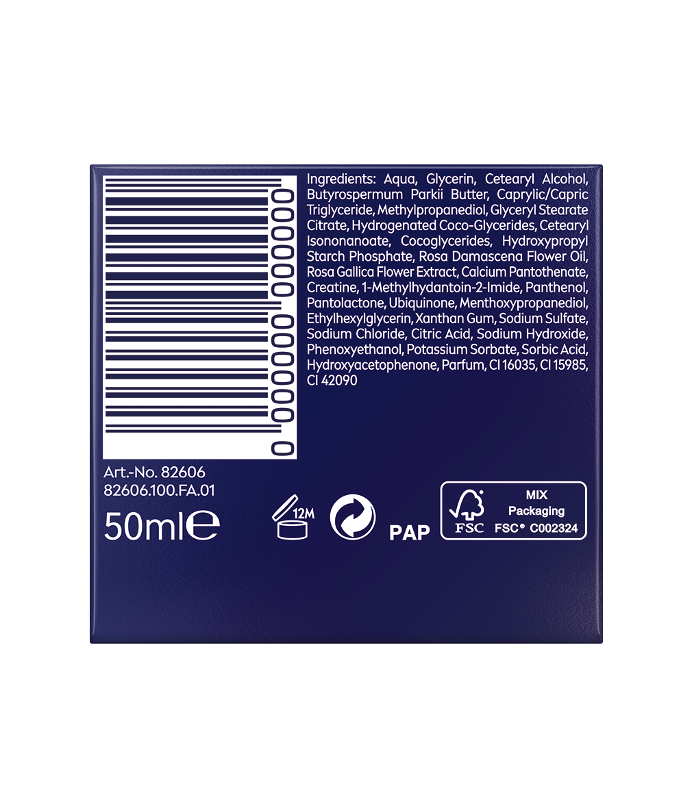 Inkludiert Aqua, Glycerin, Cetearyl Alcohol, Butyrospermum Parkii Butter, Caprylic/Capric Triglyceride, Methylpropanediol, Glyceryl Stearate Citrate, Hydrogenated Coco-Glycerides, Cetearyl Isononanoate, Cocoglycerides, Hydroxypropyl Starch Phosphate, Rosa Damascena Flower Oil, Rosa Gallica Flower Extract, Calcium Pantothenate, Creatine, 1-Methylhydantoin-2-Imide, Panthenol, Pantolactone, Ubiquinone, Menthoxypropanediol, Ethylhexylglycerin, Xanthan Gum, Sodium Sulfate, Natriumchlorid, Zitronensäure, Sodium Hydroxide, Phenoxyethanol, Potassium Sorbate, Sorbic Acid, Hydroxyacetophenone, Parfum, CI 16035, CI 15985, CI 42090