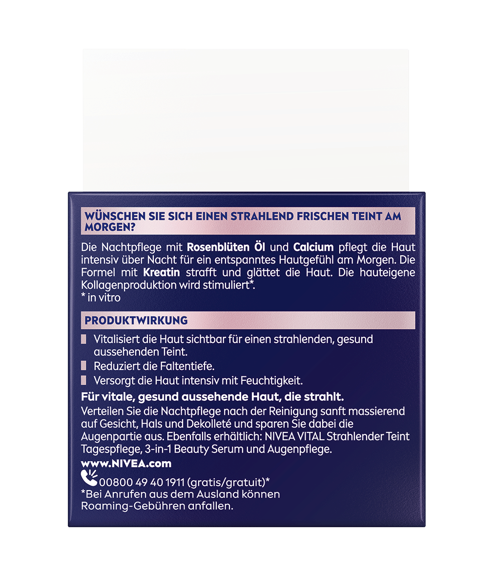 NIVEA VITAL Strahlender Teint Regenerierende Nachtpflege mit Rosenblüten-Öl lässt Ihre Haut aufblühen. Die Nachtcreme ist für reife Haut entwickelt, für einen frischen Teint: NIVEA VITAL Strahlender Teint Regenerierende Nachtpflege.