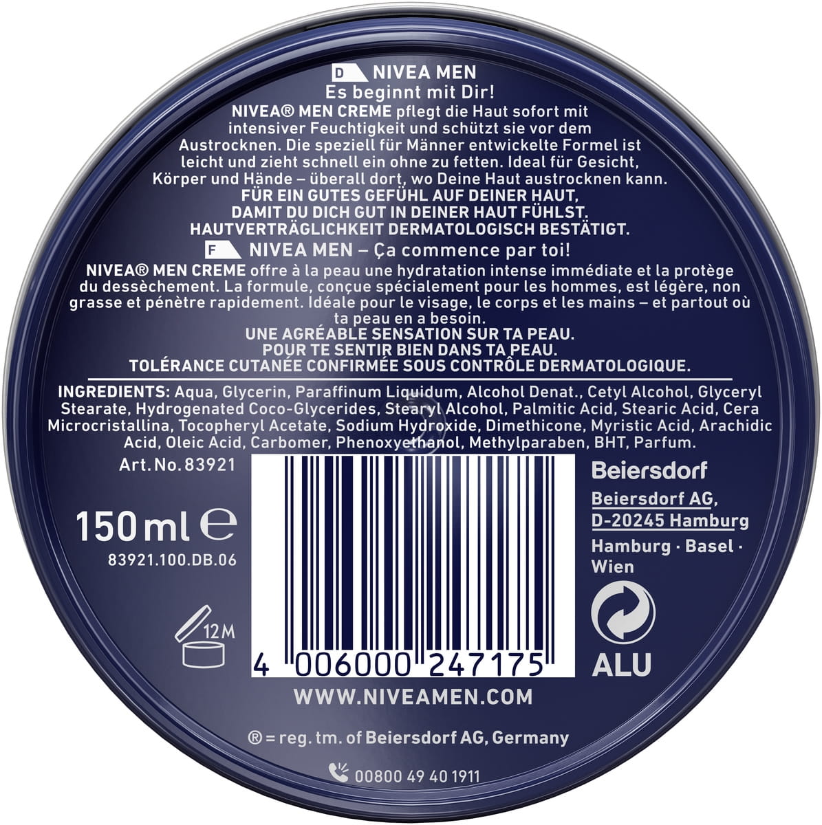 Die NIVEA MEN Creme pflegt deine Haut, indem sie ihr einen sofortigen Feuchtigkeits-Boost verleiht und sie vor dem Austrocknen schützt. Die leichte Formel ist nicht fettend, nicht klebrig und zieht schnell ein. Speziell für Männer entwickelt, eignet sie sich für Gesicht, Körper und Hände – überall dort, wo deine Haut Pflege braucht. Damit du dich wohl in deiner Haut fühlst. Die Hautverträglichkeit der NIVEA MEN Creme ist dermatologisch bestätigt. NIVEA ist in über 160 Ländern präsent und gehört mit mehr als 140 Jahren Erfahrung zu den größten und vertrauenswürdigsten Hautpflegemarken der Welt. Als Marktführer in der globalen Hautpflegebranche arbeiten unsere Forscher intensiv daran, hochwertige und dermatologisch geprüfte Produkte für verschiedene Hauttypen und -bedürfnisse anzubieten.