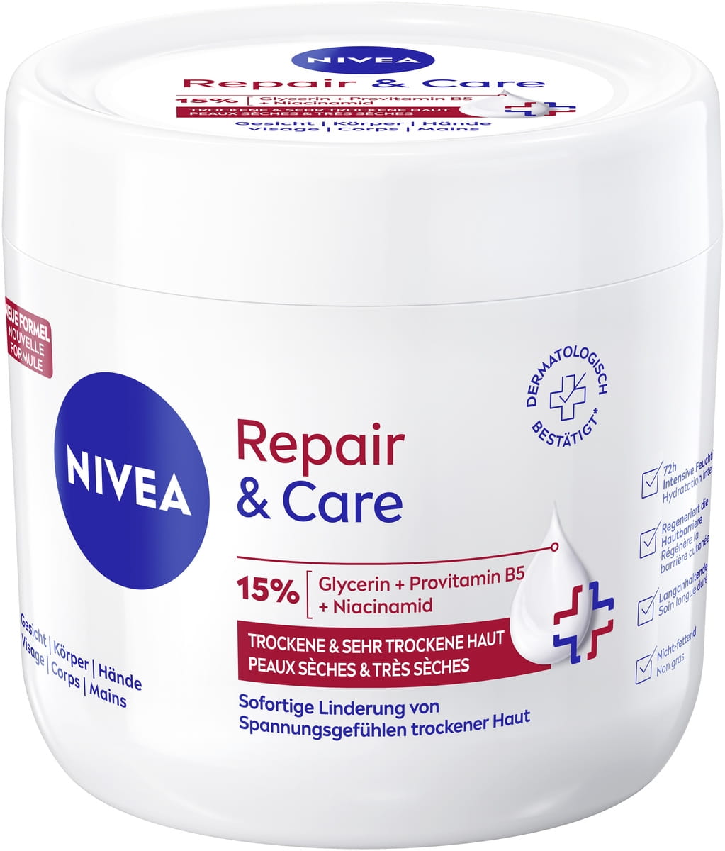 Die NIVEA Repair & Care Intensive Creme bietet sofortige Linderung für trockene Haut und Feuchtigkeit. Sie stärkt die Hautbarriere, enthält 15 % Glycerin, Provitamin B5, Niacinamid für die Feuchtigkeitsversorgung, ist hypoallergen, nicht fettend, zieht schnell ein. Geeignet für Kinder ab 3 Jahren.