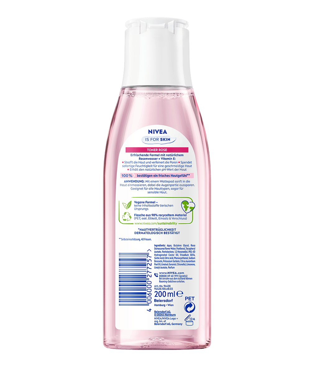 Der NIVEA Rose Care Feuchtigkeitsspendende Toner Die erfrischende Formel mit konzentriertem natürlichem Rosenwasser und Vitamin E spendet sofort Feuchtigkeit, strafft die Haut und verfeinert die Poren – für ein glattes und frisches Hautgefühl.