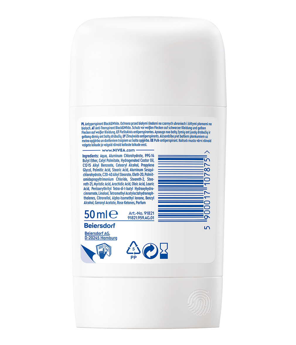 NIVEA Black & White Invisible mit Dual-Shield-Technologie schützt schwarze Kleidung vor weißen Flecken und weiße Kleidung vor Vergilbung. Zuverlässiges 72-Stunden-Antitranspirant gegen Schweiß und Geruch, das Ihre Haut und Ihre Kleidung schützt.