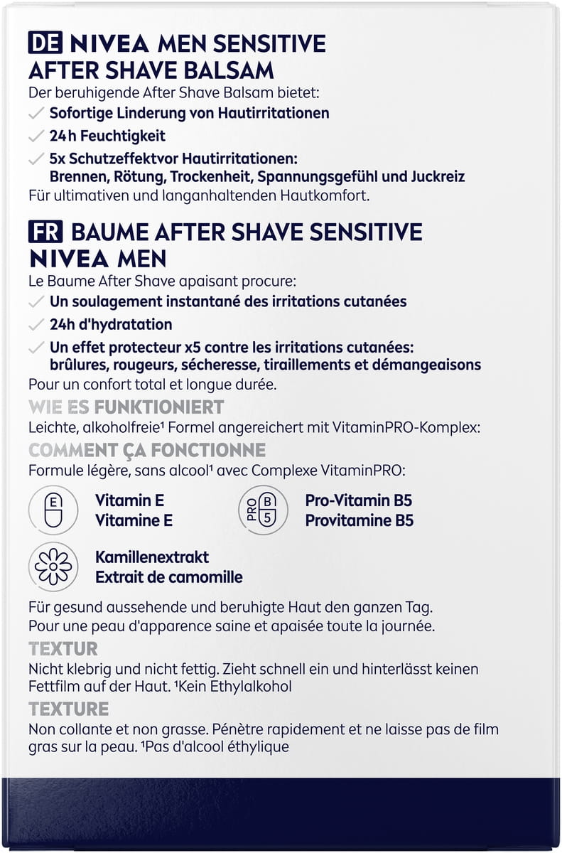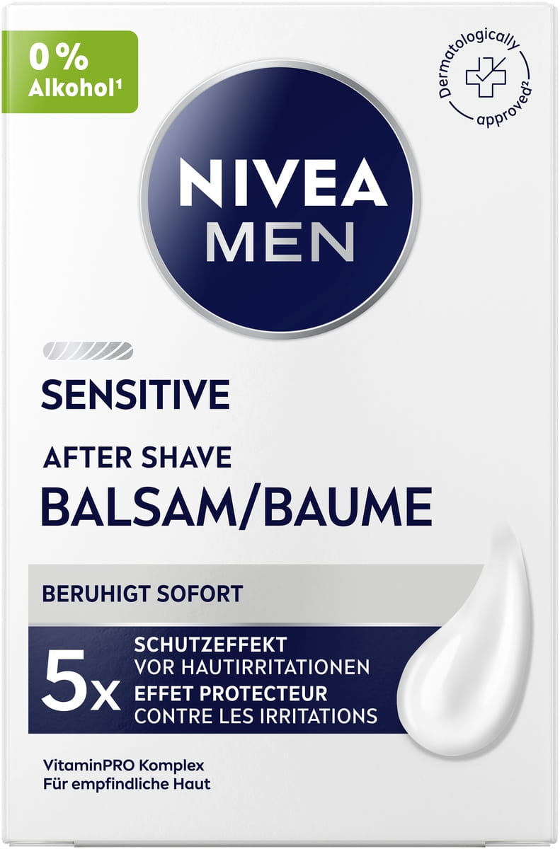 NIVEA MEN Sensitive After Shave Balsam beruhigt empfindliche Haut nach der Rasur sofort, ohne zu brennen. Mit Vitamin E, B5 und Kamille – für ein glattes, gesundes und gepflegtes Hautgefühl.