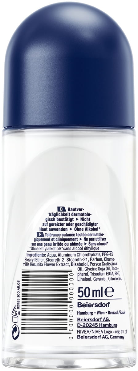 Inkludiert Aqua, Aluminum Chlorohydrate, PPG-15 Stearyl Ether, Steareth-2, Steareth-21, Parfum, Bisabolol, Chamomilla Recutita Flower Extract, Glycine Soja Oil, Persea Gratissima Oil, Tocopherol, Trisodium EDTA