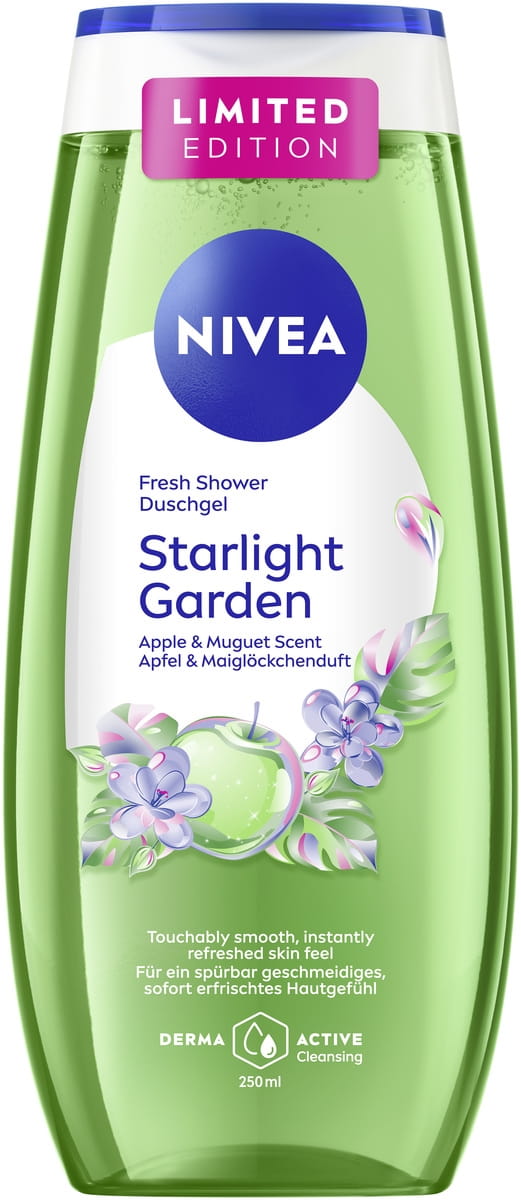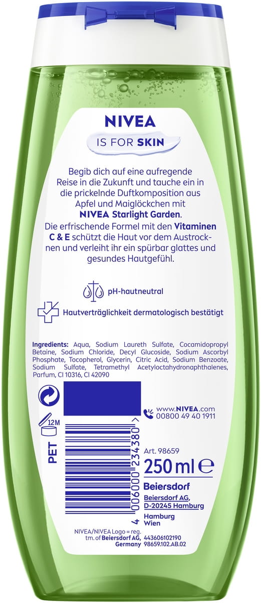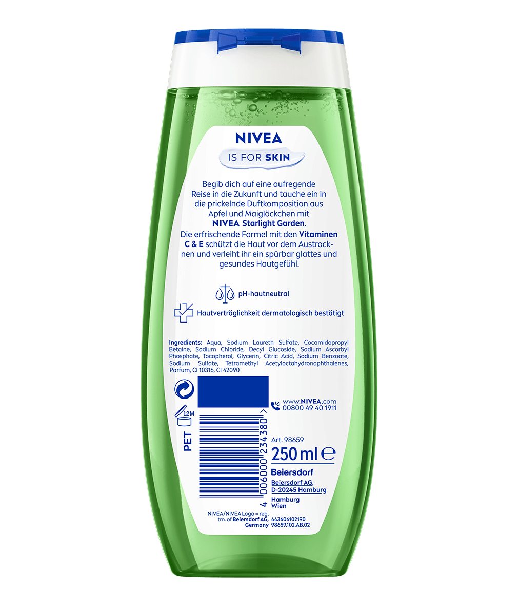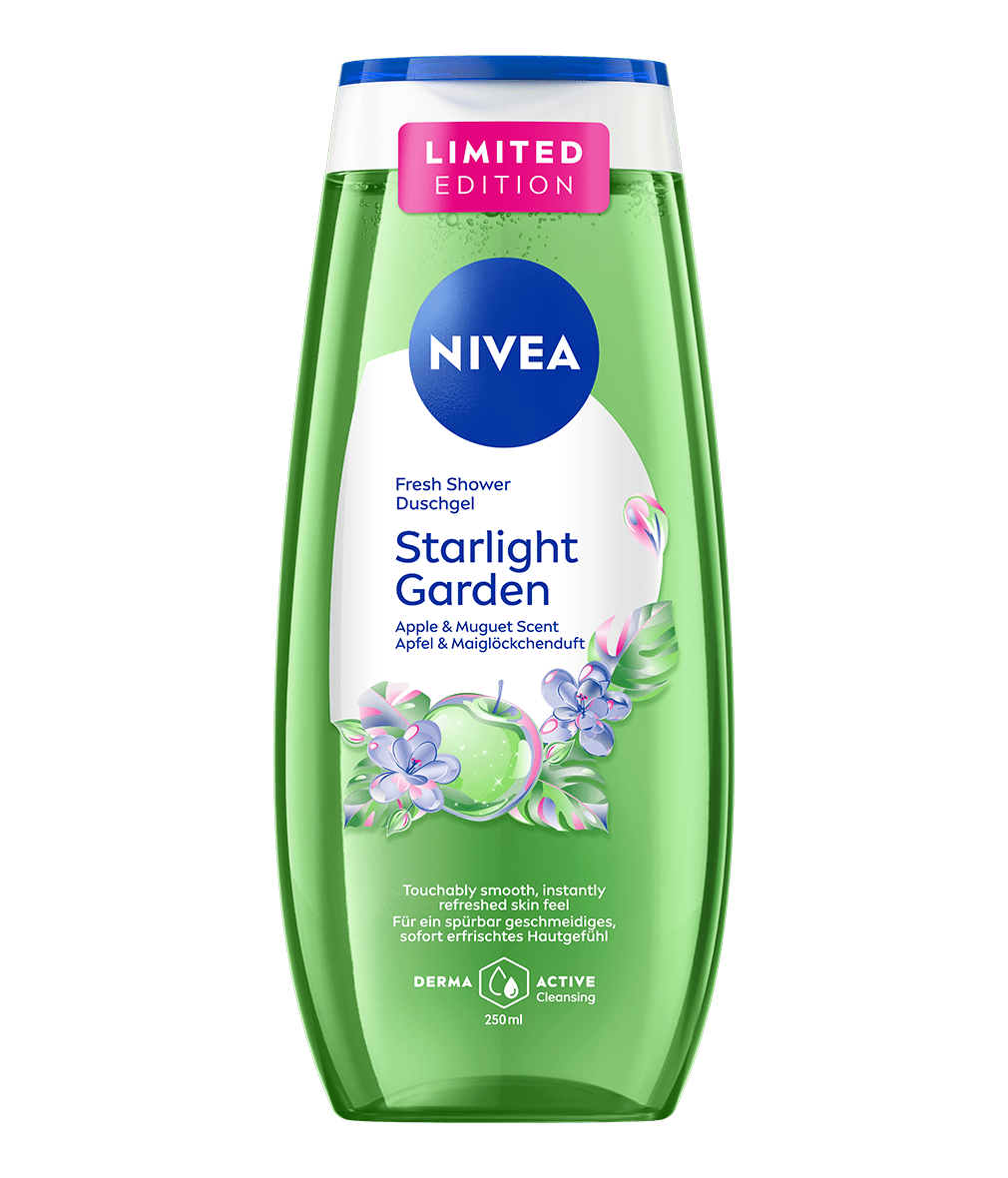 Begeben Sie sich mit NIVEA Starlight Garden auf eine aufregende Entdeckungsreise in die Zukunft und lassen Sie sich von der funkelnden Duftkomposition aus Apfel und Maiglöckchen verzaubern. Die erfrischende Formel mit den wertvollen Vitaminen C und E schützt Ihre Haut zuverlässig vor dem Austrocknen und sorgt für ein spürbar glattes, gesundes Hautgefühl. Dank ihrer pH-hautneutralen Zusammensetzung ist sie besonders sanft und wurde dermatologisch auf Hautverträglichkeit getestet – ideal für die tägliche Pflege. NIVEA steht nicht nur für hochwertige Hautpflege, sondern auch für Verantwortung gegenüber der Umwelt: Die Formel ist mikroplastikfrei und zu 99 % biologisch abbaubar. Erleben Sie ein Dufterlebnis, das Frische, Pflege und Nachhaltigkeit vereint – für ein gutes Gefühl, das den ganzen Tag anhält. Spüren Sie Pflege, die begeistert und bleibt.