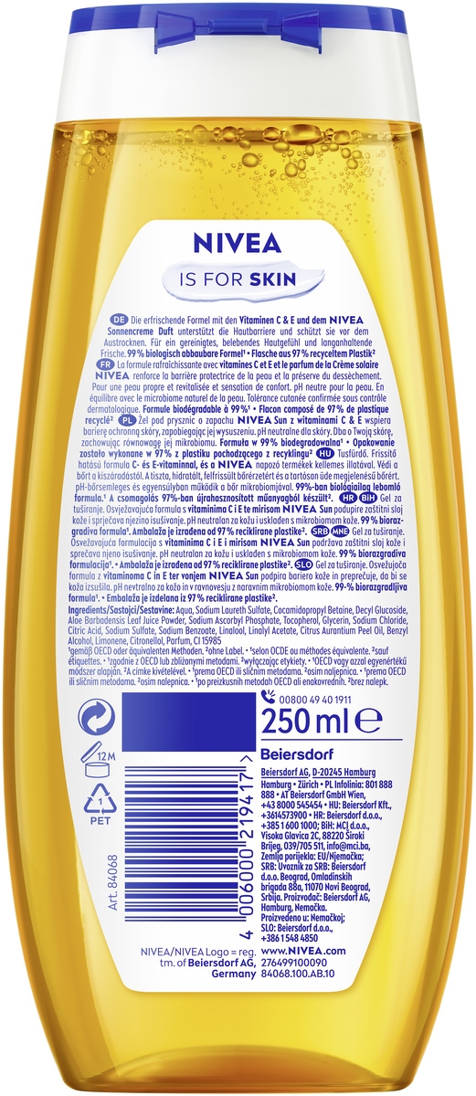 NIVEA Summer Happiness Duschgel: Erfrischende Formel mit Vitamin C, E und NIVEA Sun-Duft unterstützt die Hautbarriere und verhindert das Austrocknen der Haut für ein sauberes, gepflegtes, belebtes Hautgefühl und lang anhaltende Frische. pH-hautneutral und im Gleichgewicht mit dem hauteigenen Mikrobiom.