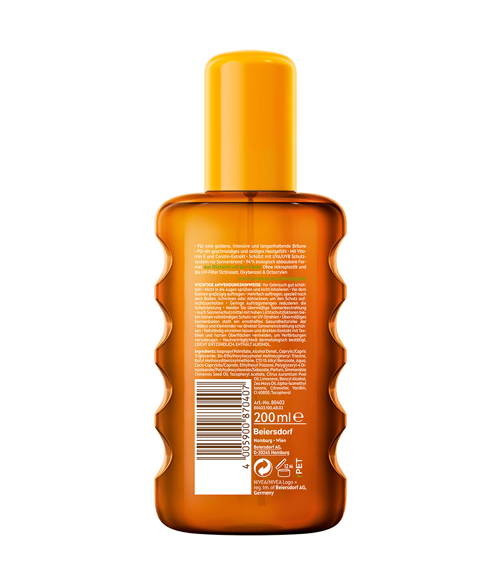 Der Sonnenschutz für eine intensive und schöne Bräune mit Karottenextrakt und ohne Selbstbräuner. Ozeanfreundliche Formel. NIVEA SUN Tropical Bronze Sonnenöl.